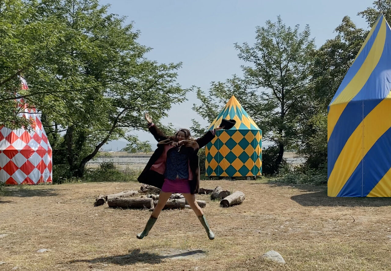 Colorful and lightweight textile nomadic tents, with colorful patterns, together creating a fairytale meadow.