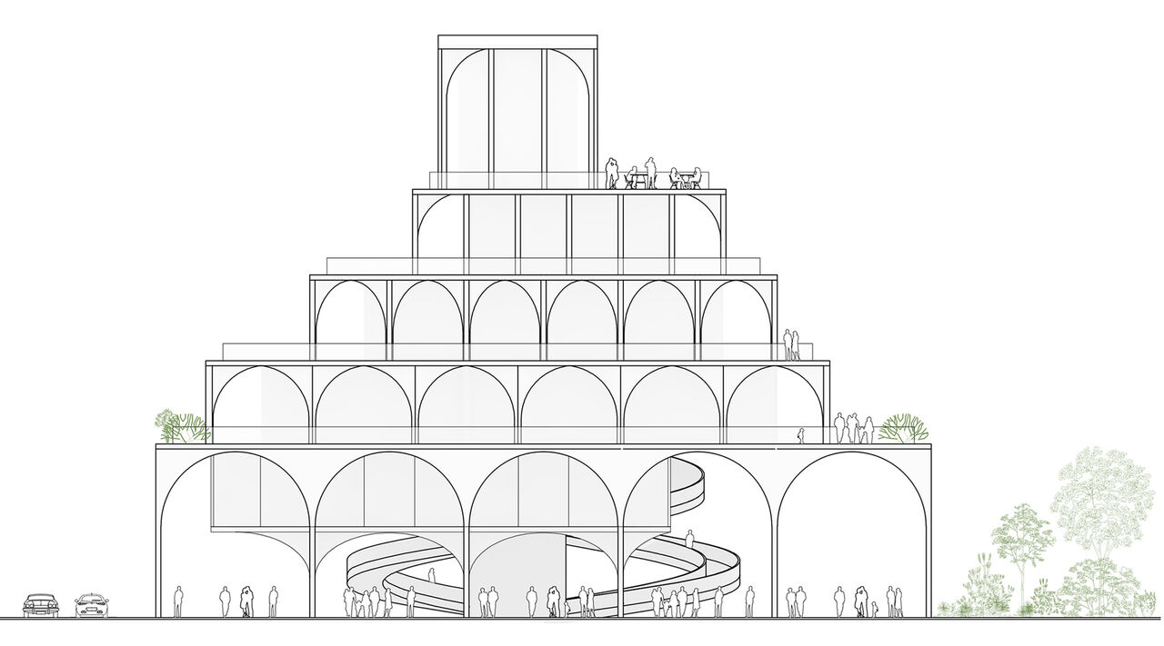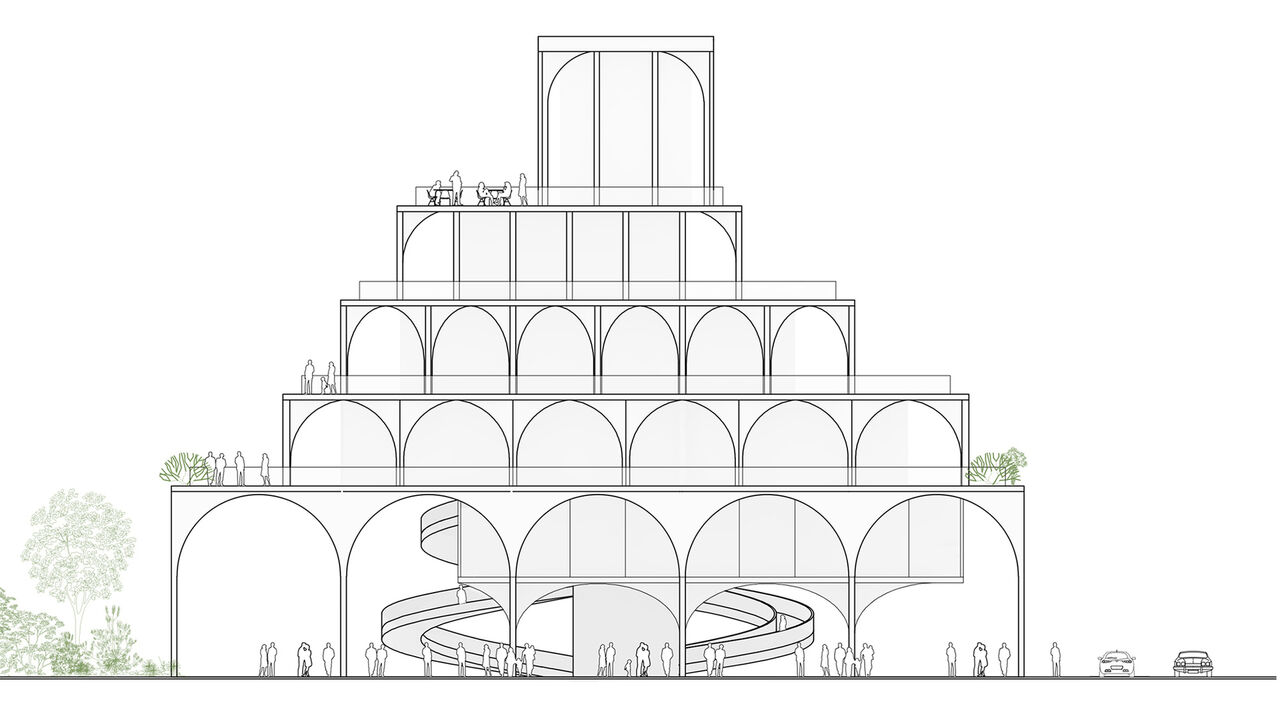 Museum of Ethnography in the Central park in Budapest, Hungary. Analogous to the archaic typologies such as pyramids and mastabas, the building consists of a stack of layers, reflecting the complexity and depth of the Ethnographical science. Ground floor is a vast urban plaza under the arched vaults which connects the park and the city, with a central public forum - amphitheater under the double spiral ramp.