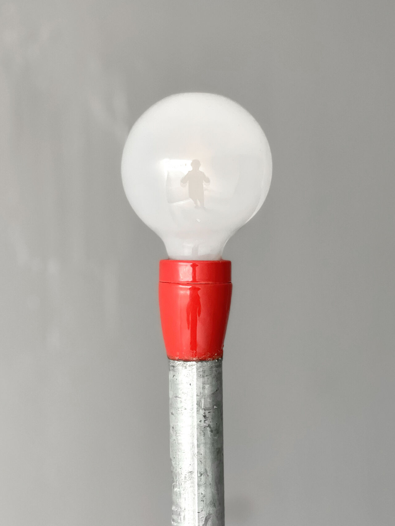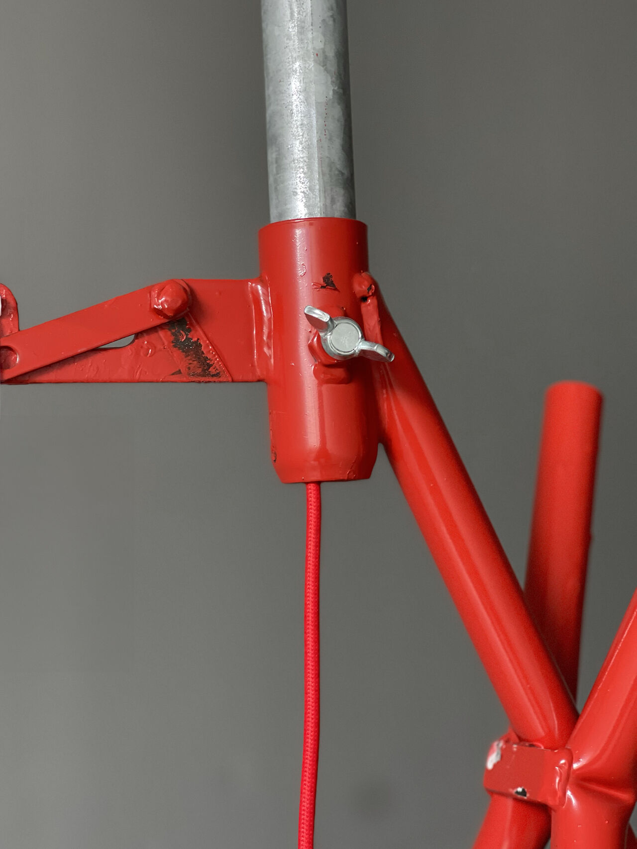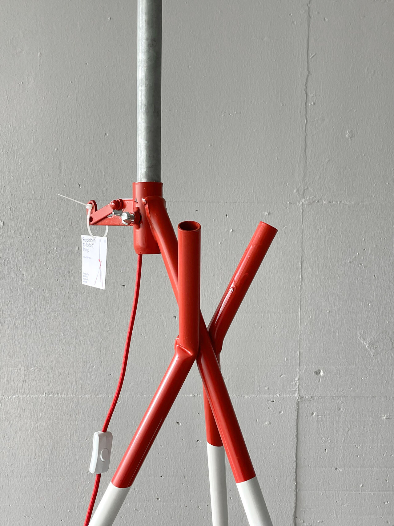 Having as a base a Swiss street / traffic tripod stand for “NO PARKING” and other restrictive signs, this standing lamp is transformed from an object that forbids and prohibits to an object that gives light.