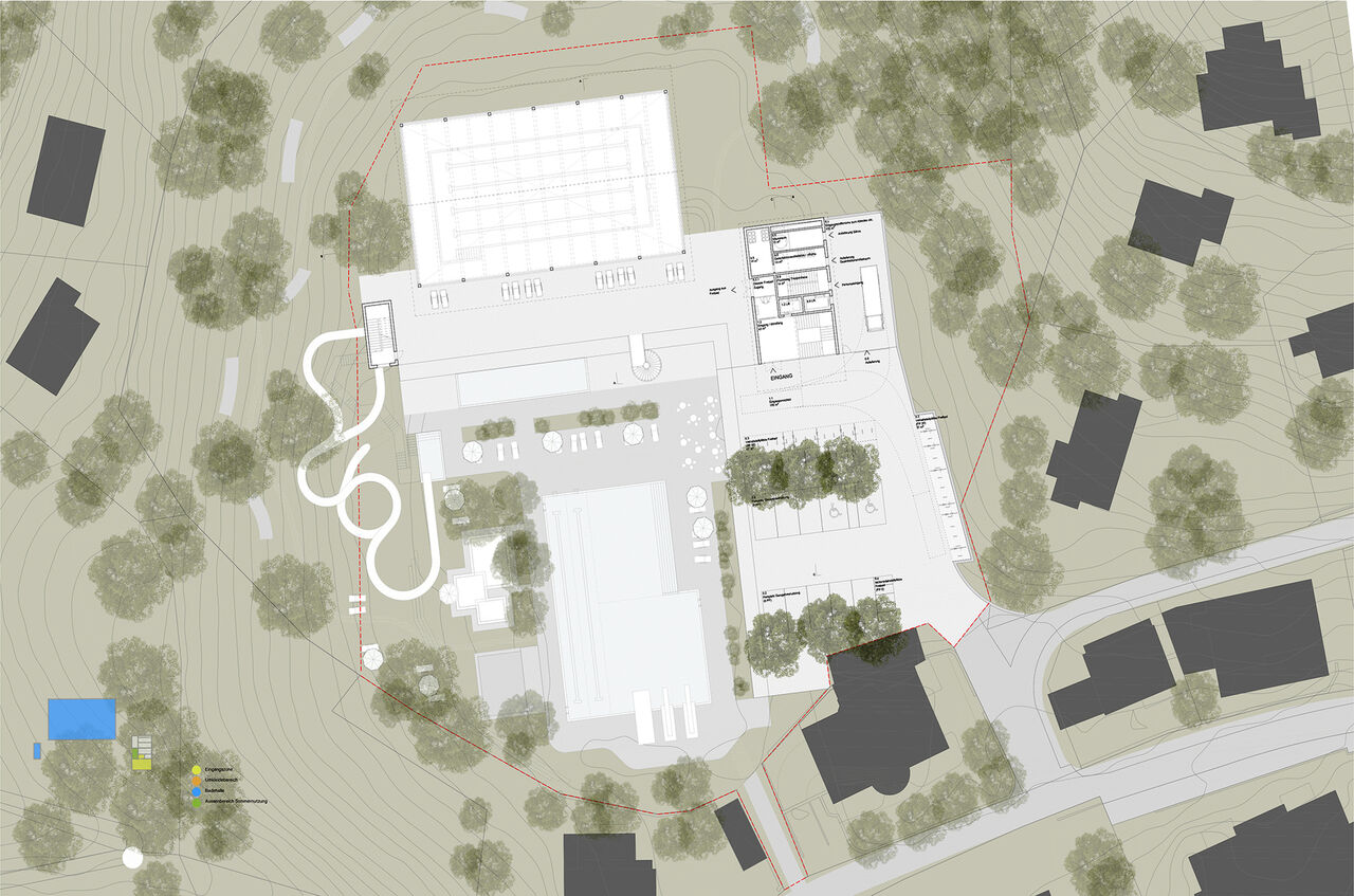 The project proposes the relocation of the indoor swimming pool to the southern edge of the Sonnenberg site. This will create a new outdoor pool and an extensive green and open space between the indoor pool and the semicircular arena in the north of the Sonnenberg site.