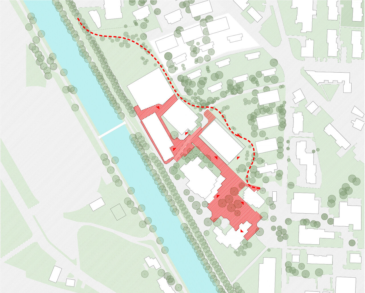 The project provides a compact school building with minimal footprint adjacent to the existing school complex, maximizing open space for the development of a new park, a new biotope. This allows for a minimum of new, undeveloped land and maximizes the development of existing paved areas. This decision to locate the school as close as possible to the existing school buildings (while retaining needed sunlight) completes the urban composition of the historic school campus.